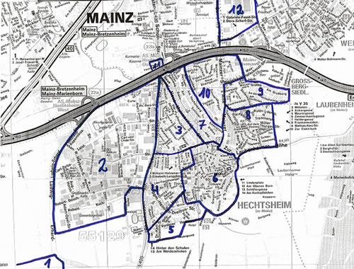 Auch die Verkehrslage Mainz- Hechtsheims ist aufgrund der direkten Verbindung an die Rheinhessenstrasse besonders günstig. Eine optimale Verbindung ins rheinhessische Umland wird zudem durch den Ausbau des Mainzer Autobahnrings mit zwei Autobahnanschlüssen stark gefördert und bietet, vor allem für Unternehmen die Waren transportieren müssen oder eine gute Verkehrsanbindung benötigen, eine hohe Standortqualität. Trotz des Baues des Gewerbegebietes, der Messe und der Neubaugebiete hat Hechtsheims alter Ortskern seinen dörflichen Charakter bewahrt. Was für viele Hechtsheimer von großer Bedeutung ist und Ihre Wohnortwahl bestimmt hat. Die Erhaltung des dörflichen Charakters konnte dadurch gewährleistet werden, dass der alte Ortskern, der in Karte 1mit der Zahl 6 markiert wurde, nicht verändert wurde. Die neueren Gebiete, wie das Neubaugebiet und das Gewerbegebiet, die bei dieser Dorferweiterung entstanden, wurden nämlich etwas abseits des Ortskerns gebaut. So kam es dazu, dass die Neubaugebiete von Mainz - Hechtsheim in fast alle Himmelsrichtungen erweitert wurden. Zum Neubaugebiet zählt hiernach das Gebiet um das Bürgerhaus, das in Karte 1 mit der Zahl 5 markiert wurde, im Süden das Mühldreieck, das in Karte mit 1 mit Nummer 4 gekennzeichnet wurde, im Osten die Frankenhöhe, die in Karte 1 mit der Nummer 8 markiert wurde und im Südwesten das Gebiet um die Neue Mainzer Strasse mit der Nummer 3 in Karte 1. Die einzelnen Stadtteile von Mainz werden im anschließenden Teil 5 näher erläutert.
